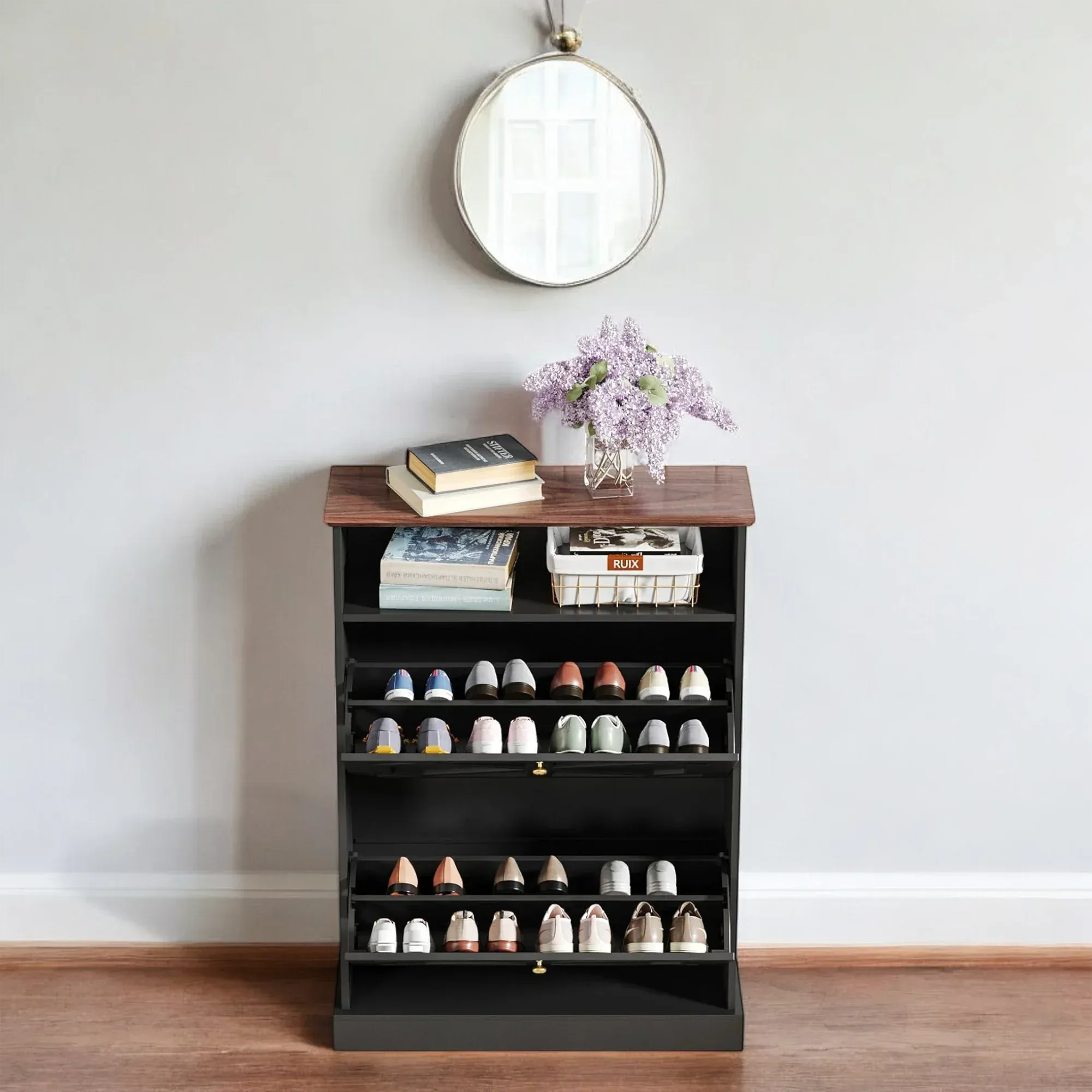 The interior tiers work best for casual shoes and light daily pairs. The door movement is steady and the handles are shaped for an easy grip. Surfaces are smooth for simple cleaning with a soft cloth. Edges are rounded for a comfortable hand feel. The cabinet is intended for indoor residential use in entries, hallways, and bedrooms where closed storage supports daily order.