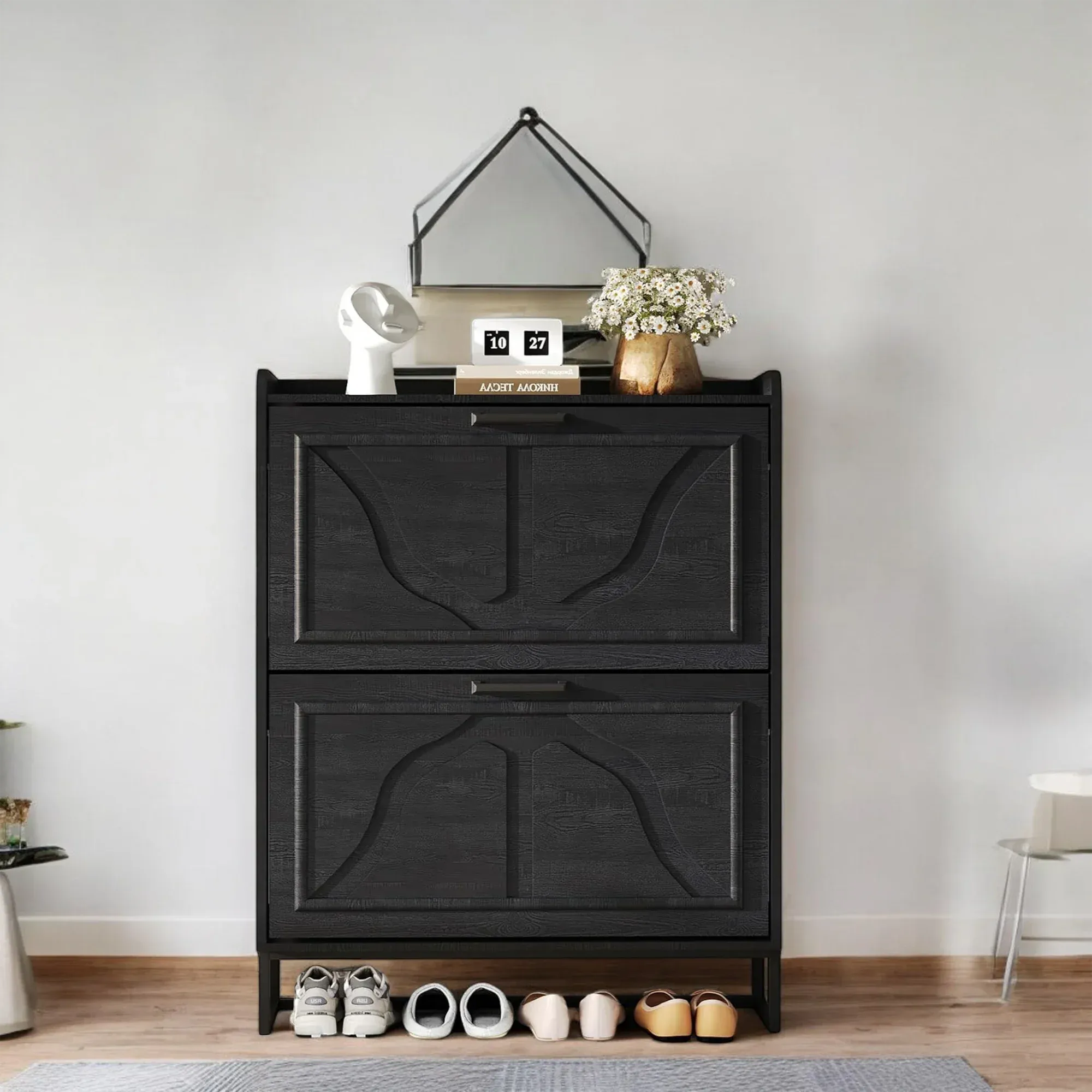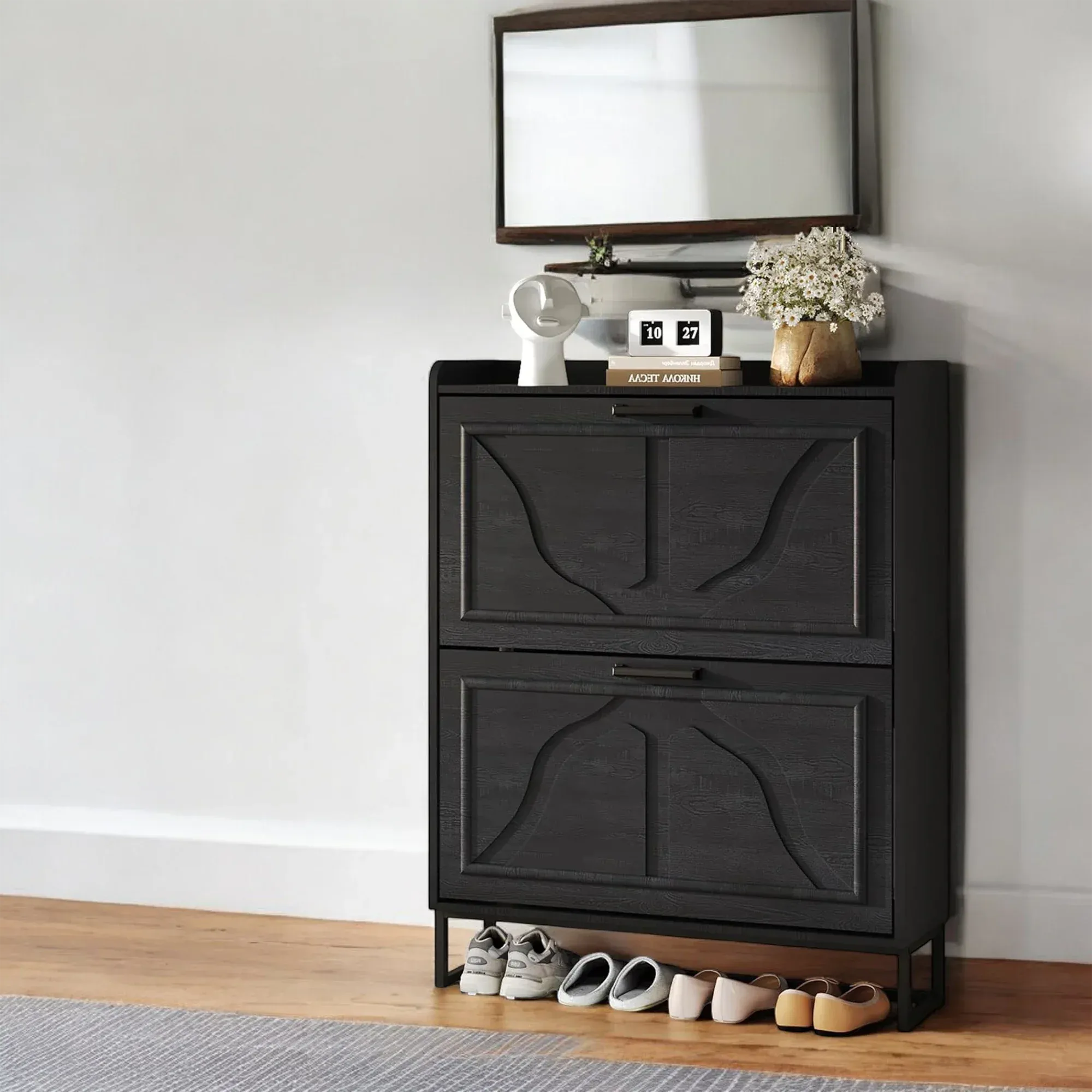 Slate is a compact black shoe cabinet designed for modern entries that need simple closed storage. The flip drawer layout presents pairs when opened and then closes to sit flat against the wall. The form is short and narrow so it fits beside a door or in a hallway while still providing useful capacity for daily footwear. The finish is even and easy to maintain and the top can hold a catchall tray or a small plant to settle the space.