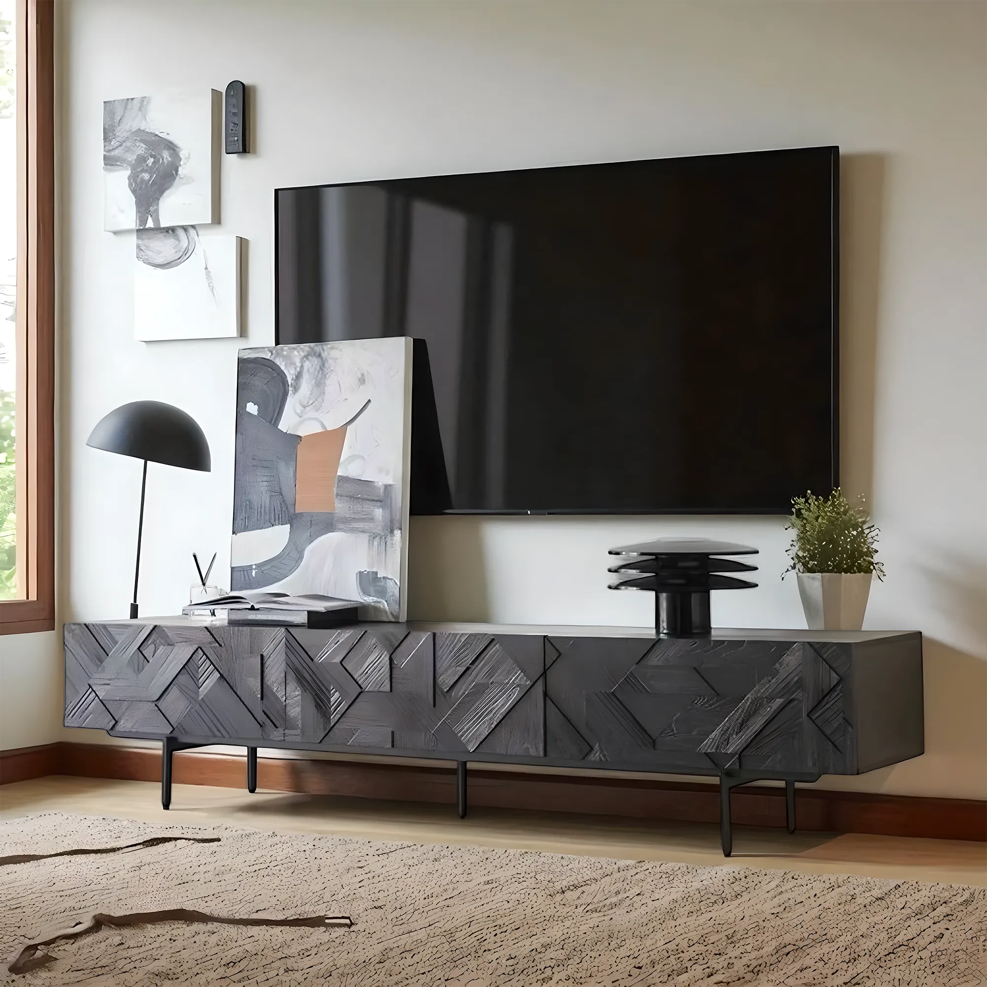 The console is built for indoor residential use and daily routines. Surfaces are smooth to the touch and easy to wipe with a soft cloth. The open shelf allows air flow around electronics and supports basic cable management. Edges are rounded for a comfortable hand feel when placing devices. The top is flat and stable for a television within the weight and size limits of the furniture. Place the console on a level floor and keep away from direct heat sources for best performance.